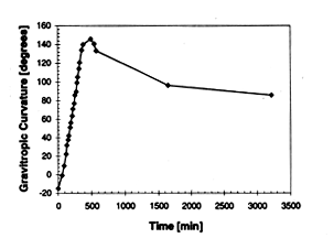 The general way of measuring gravitropic curvature during experiments is shown in picture 2. With a protractor lined up along the top part of the shoot angles could be recorded with an accuracy of about 1o.